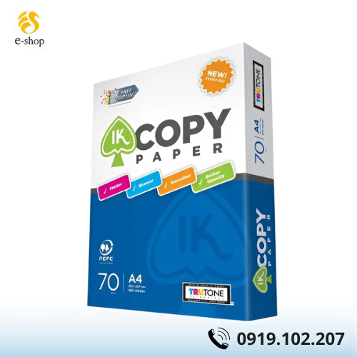 Giấy IK COPY PAPER 70gsm - Xuất xứ Indonesia trắng sáng chất lượng tuyệt hảo, không bị kẹt giấy, cho chất lượng in sắc nét, thích hợp cho tất các loại máy in và máy photocopy hiện đại .
